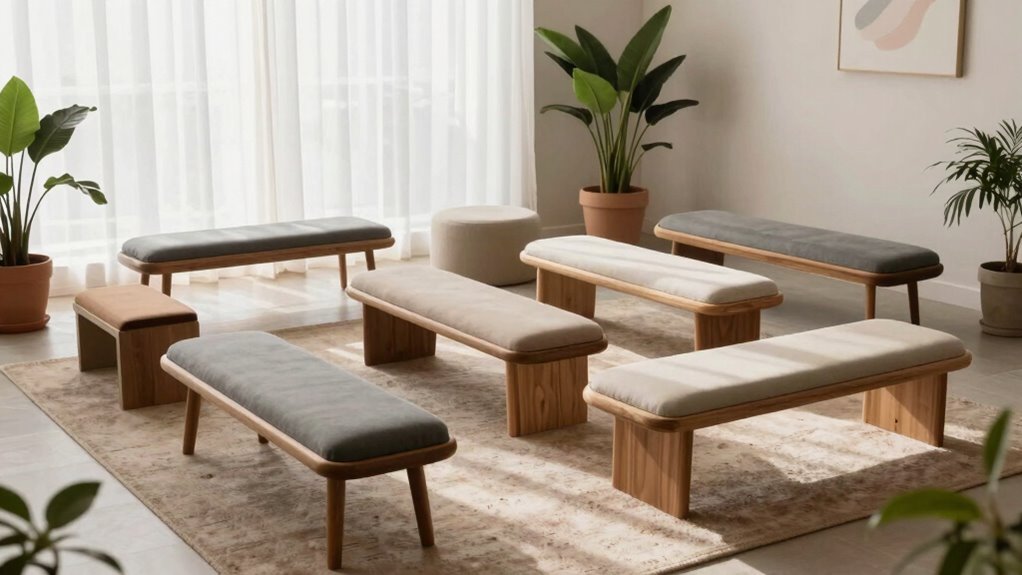 When it comes to finding the right meditation bench, height and adjustability play a significant role in guaranteeing comfort and proper posture. Adjustable benches let you customize the height to match your body type and seating style, whether kneeling or sitting cross-legged. The ideal height generally ranges from 4 to 6 inches, depending on your height and flexibility. A well-adjusted bench helps reduce strain on your knees, hips, and lower back by keeping your seat at an ergonomic level. Look for benches with easy-to-use, secure adjustment mechanisms that stay stable during meditation. This prevents accidental changes and keeps you focused. Prioritizing adjustability ensures your meditation practice remains comfortable, supportive, and adaptable to your changing needs.