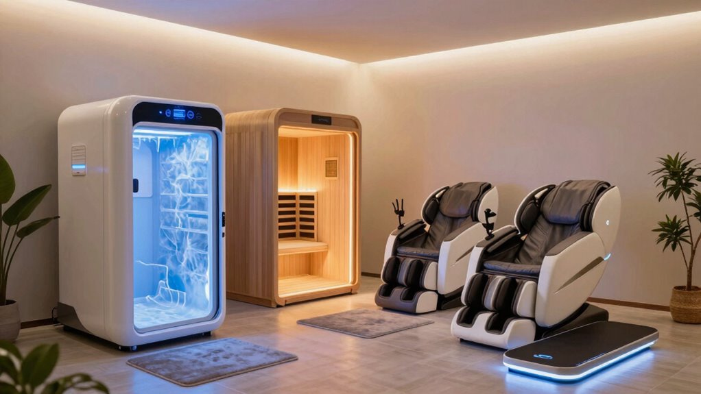 In 2026, the best recovery tech for your home wellness room includes heated neck and shoulder wraps, ankle support and compression sleeves, cordless leg massagers, and pulse oximeters for health monitoring. These devices offer personalized heat, massage, and compression therapies, plus safety features like auto-shutoff. Space-efficient and easy to use, they help relieve muscle pain, swelling, and fatigue. If you’re curious about selecting the right options, I’ve got more tips to share.